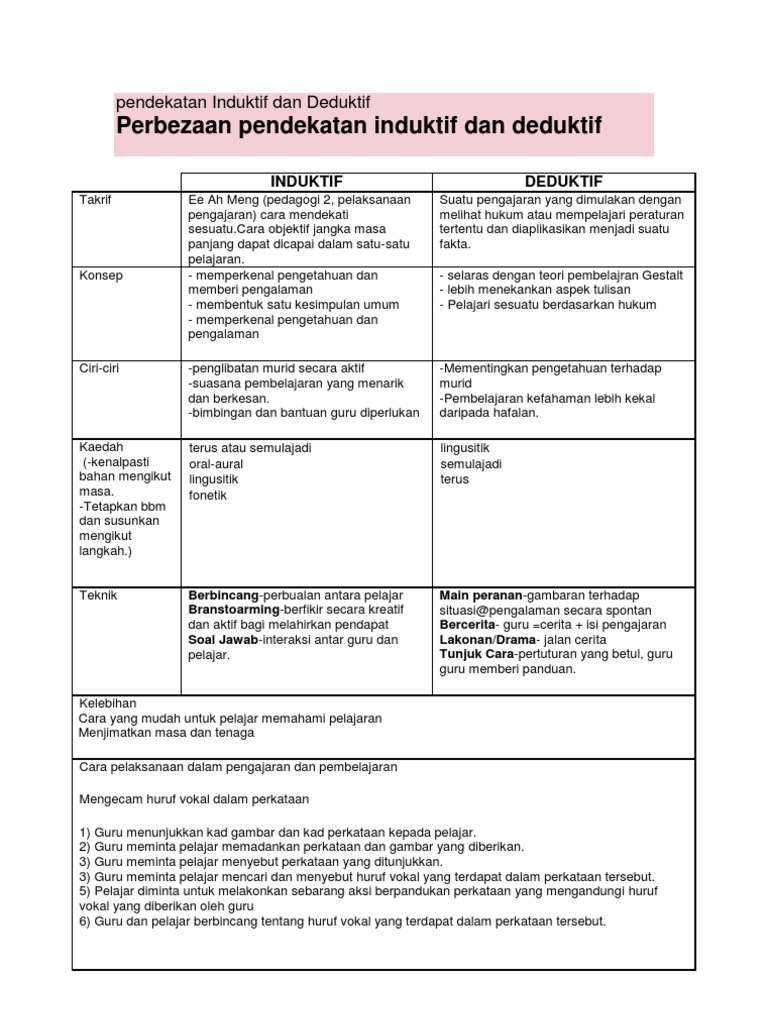 Murid- murid dapat memahami sesuatu yang baru. Karakteristik dari pendekatan induktif-deduktif adalah sebagai berikut. Menurut JM Kierzek dan WGibson 1960 pendekatan induktif dimulakan dengan sesuatu sebab atau contoh dan menuju ke arah sesuatu generalisasi.